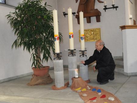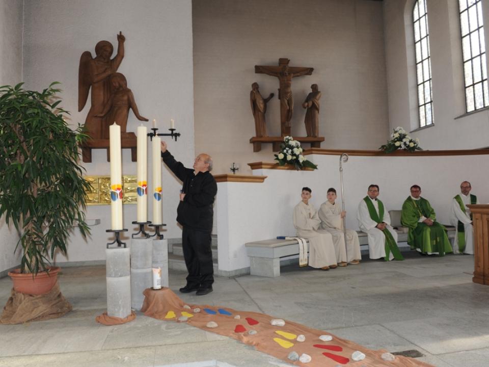 Drei gesegnete Kerzen werden künftig in den Kirchen des Pastoralraumes brennen. Das Logo symbolisiert in Form von Muscheln (Erinnerung an den Jakobsweg) die drei Farben der Gemeinden – gelb, blau und rot – in der Mitte der Auferstandene. Die Farben fliessen ineinander, ein Zeichen der Gemeinsamkeit, der Zusammengehörigkeit, des Miteinander.